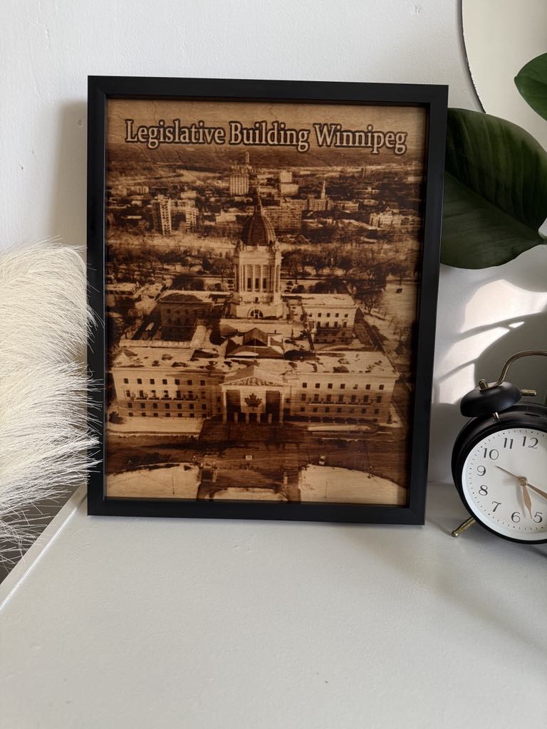 Burned wood artwork featuring an aerial view of the Legislative Building in Winnipeg — a powerful symbol of Manitoba’s history and architecture. This piece captures the city’s heart in timeless tones, making it a perfect gift for proud Winnipeggers, newcomers, or anyone who appreciates iconic local landmarks. A classy and meaningful addition to any home, office, or gallery wall.