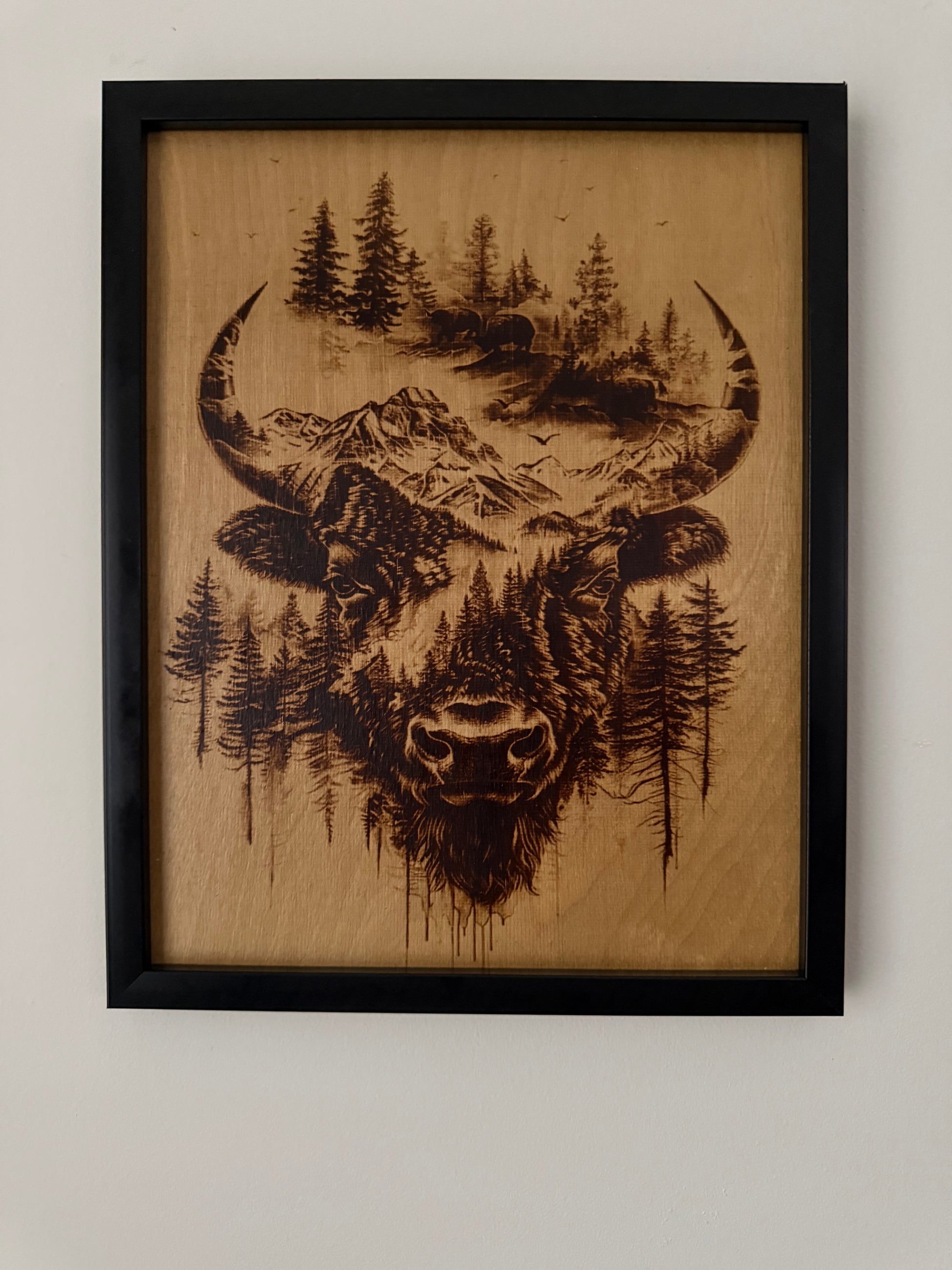 This burned artwork captures the raw power of the wild — a majestic bison emerging from a landscape of pine forests and mountain peaks. The animal’s face is seamlessly blended with nature, forming a powerful symbol of strength and harmony. Look closer, and you’ll spot bears wandering through the woods above its horns — a quiet nod to the interconnected spirit of wildlife. Burned on birch plywood and framed in sleek black, this piece is bold, grounded, and unforgettable.