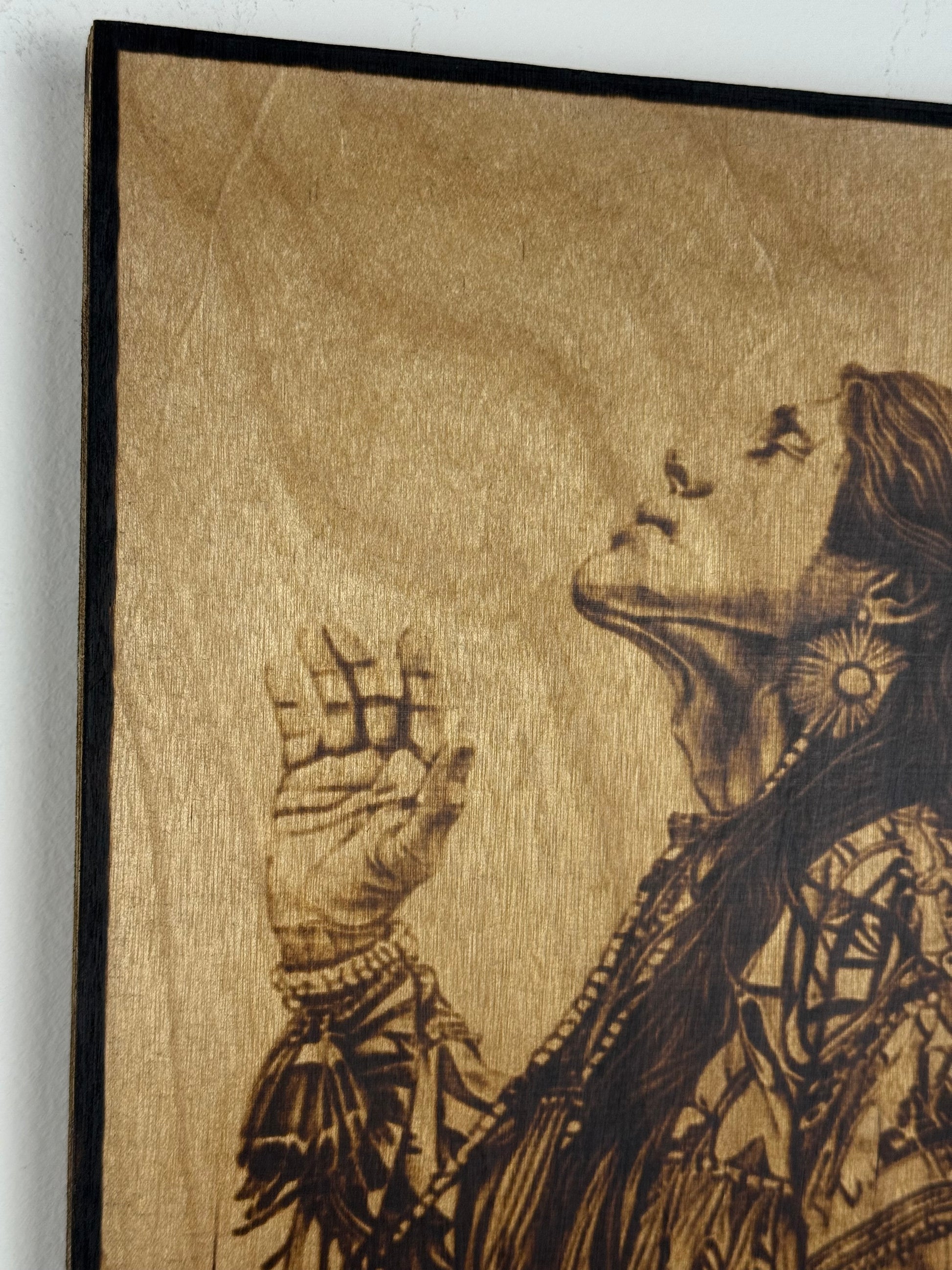 Bring timeless artistry into your space with this stunning wood-burned Native-inspired portrait. Crafted with exceptional detail, this piece captures the spirit and strength of Indigenous culture, making it a striking centerpiece for any room.